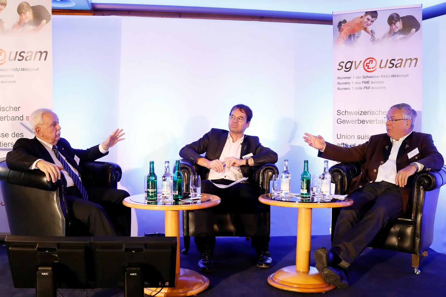 Wie wichtig die Verbundpartnerschaft in der Berufsbildung ist und dass eine allfällige Tendenz zur Verstaatlichung vermieden werden muss, wurde im anschliessenden Podium diskutiert. Bezüglich Verbundpartnerschaft hätte man in der Praxis gerade bei der Finanzierung oft den Eindruck, wer zahlt befiehlt“, so sgv-Direktor und Nationalrat (FDP/ZH) Hans-Ulrich Bigler an die Adresse von Bund und Kantonen. „Die Organisationen der Arbeitswelt OdA werden nicht auf Augenhöhe wahrgenommen.“ Darauf entgegnete Josef Widmer, stellvertretender Direktor des Staatssekretariats für Bildung, Forschung und Innovation SBFI, unser duales System sei sehr arbeitsmarktorientiert. „Bei uns sagt die Wirtschaft, was sie braucht.“ In gewissen Teilbereichen gehe die Harmonisierung etwas zu weit, gibt Ständerat Stefan Engler (CVP/GR) zu bedenken. „Das Tempo von Staat und Wirtschaft sind halt nicht immer aufeinander abgestimmt.“ Nationalrat Adrian Amsturz (SVP/BE) kam auf die Akademisierung der Berufe zu sprechen und forderte eine anforderungsgerechtere Ausbildung: „Wir haben zu viele Theoretiker und zu wenig Praktiker“, so der Präsident des Schweizer Nutzfahrzeugverbandes ASTAG. Hier seien ganz klar die Berufsverbände und Unternehmen gefordert, sich einzubringen, konterte Theo Ninck, Präsident der Schweizerischen Berufsbildungsämter-Konferenz SBBK.