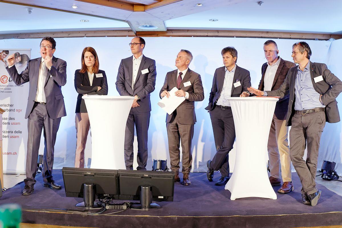 Hess und Candias waren sich einig, dass überbordende Regulierungen zwar schädlich, Verordnungen, Rundschreiben und Weisungen aber oft viel gefährlicher als Gesetze seien, weil sich hier die Verwaltung oft unkontrolliert austobe. Grossen warb für Anreizsysteme und Lenkungsabgaben statt Regulierungen und Verbote, Gössi plädierte für eine ausserhalb der Verwaltung zu schaffende Instanz zur Abschätzung von Folgen der Regulierung – was Grossen klar ablehnte –, Hess warb für die BDP-Idee einer staatlichen KMU-Strategie und Rösti wurde konkret: «Kommen Anliegen wie die Konzernverantwortungsinitiative durch, so werden solch unsinnige Regulierungen früher oder später auch auf KMU durchschlagen.»