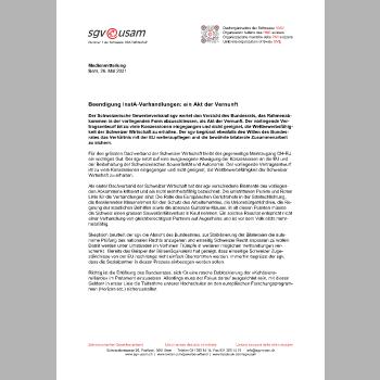 Der Schweizerische Gewerbeverband sgv wertet den Verzicht des Bundesrats, das Rahmenabkommen in der vorliegenden Form abzuschliessen, als Akt der Vernunft. Der vorliegende Vertragsentwurf ist zu viele Konzessionen eingegangen und nicht geeignet, die Wettbewerbsfähigkeit der Schweizer Wirtschaft zu erhalten. Der sgv begrüsst ebenfalls den Willen des Bundesrates das Verhältnis mit der EU weiterzupflegen und die bewährte bilaterale Zusammenarbeit zu sichern.