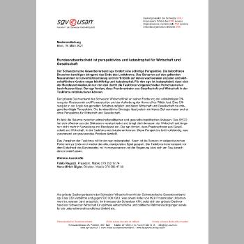 Der Schweizerische Gewerbeverband sgv fordert eine sofortige Perspektive. Die betroffenen Branchen benötigen dringend das Ende des Lockdowns. Das Beharren auf den geltenden Massnahmen ist unverhältnismässig und im Hinblick auf deren wachsenden sozialen und wirtschaftlichen Kosten sogar leichtfertig und katastrophal. Für den sgv ist inakzeptabel, dass sich der Bundesrat wiederum nur von den durch die Taskforce vorgezeichneten Horrorszenarien beeinflussen lässt. Der sgv fordert, dass Praxisvertreter aus Gesellschaft und Wirtschaft in der Taskforce mitdiskutieren können.