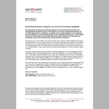 Der Schweizerische Gewerbeverband sgv begrüsst den Entscheid des Bundesrates den Gastrobetrieben die Öffnung auch in Innenräumen zu erlauben. Insgesamt beurteilt der sgv den Öffnungsschritt als zu zögerlich, zu langsam und zu wenig weitgehend. In der Logik des gezielten Schutzes und mit Schutzkonzepten ist eine vollständige Öffnung per 17. Mai möglich. Der grösste Dachverband der Schweizer Wirtschaft fordert ausserdem die Aufhebung der besonderen Lage und die Auflösung der wissenschaftlichen Taskforce.