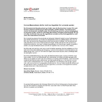 Der Vorstand des grössten Dachverbands der Schweizer Wirtschaft fordert in einem Positionspapier, dass die Berufsfachschulen und Zentren für überbetrieblichen Kurse geöffnet bleiben. Dies auch im Fall, wenn die Kantone den Präsenzunterricht ab Sekundarstufe II verbieten. Die Vermittlung praktischer Kenntnisse kann nur im Präsenzunterricht erfolgen. Bleiben die Schulen offen können auch Qualifikationsverfahren, das heisst Lehrabschlussprüfungen und Teilprüfungen regulär durchgeführt werden und junge Berufsleute werden nicht mit der Hypothek einer «Corona-Lehre» belastet.