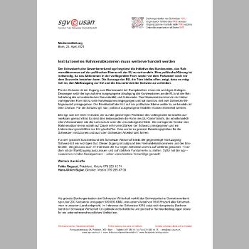 Für die Schweiz ist der Zugang zum Binnenmarkt der Europäischen Union ein wichtiges Anliegen. Deswegen setzt der sgv auf eine ausgewogene Abwägung der Konzessionen an die EU und der Beibehaltung der schweizerischen Souveränität und Autonomie. Das Rahmenabkommen in der bisher vorliegenden Form ist zu viele Konzessionen eingegangen und hat damit zu viel vom Schweizer Erfolgsmodell preisgegeben. Die Bereitschaft der EU, auf der politischen Ebene weiter zu verhandeln ist eine Chance. Für die Schweiz gilt nun: politisch ausgewogene Modelle müssen erarbeitet werden.