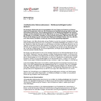 Der Zugang zum Binnenmarkt der EU sei ein wichtiges Element für die Wettbewerbsfähigkeit, das sei unumstritten. Gleichwohl müsse der Zugang im richtigen Kontext bewertet werden. Er sei eines unter vielen Mitteln zur Erhaltung und Steigerung der Schweizer Positionierung. «Wenn aber die Sicherung des EU-Marktzugangs nur mit der Übernahme von teurer EU-Regulierung und gleichzeitiger Aufgabe Schweizer Trümpfe und Souveränität möglich ist, ist dies kontraproduktiv. In dieser Form laufen wir Gefahr unsere eigene Wettbewerbspositionierung zu verlieren», sagte Fabio Regazzi vor den Medien.