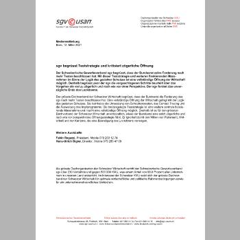 Der grösste Dachverband der Schweizer Wirtschaft begrüsst, dass der Bundesrat die Forderung des sgv nach mehr Testen beschlossen hat. Eine vollständige Öffnung der Wirtschaft gelingt mit der Logik des gezielten Schutzes. Sie beinhaltet die Umsetzung von Schutzkonzepten, das Contact Tracing und die Ausweitung des Impfprogramms. Die breitangelegte Teststrategie ist eine weitere zentrale flankierende Massnahme und macht eine vollständige Öffnung möglich. Deshalb ist es für den grössten Dachverband der Schweizer Wirtschaft unverständlich, wieso der Bundesrat eine solch zögerliche und nach wie vor perspektivlose Öffnungsstrategie fährt. Er ignoriert damit den Willen von Parlament, Wirtschaft und der Kantone, die eine Beendigung des Lockdowns verlangen.