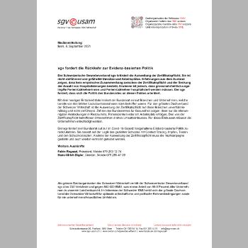 Der sgv fordert den Bundesrat auf zur im Covid-19-Gesetz festgehaltene Evidenz-basierte Politik zurückzukehren. Sie basiert auf der Logik des gezielten Schutzes mit Contact Tracing, Impfen, Testen und den Schutzkonzepten. Anstelle der Ausweitung der Zertifikatspflicht muss die Impfkampagne gestärkt und auch wieder vermehrt getestet werden.