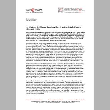 Gemäss Covid-19-Gesetz muss sich der Bundesrat bei seiner Strategie an den Grundsätzen der Subsidiarität, Wirksamkeit und der Verhältnismässigkeit orientieren. Die Einschränkungen müssen mildest- und kürzestmöglich sein. Das Drei Phasen Modell ist somit ein eklatanter Rechtsbruch. Es ist einseitig vom Fortschreiten des Impfprogramms determiniert und lässt verschiedene Fragen zum Eintreten und Nichteintreten von Grundannahmen offen. Letztlich führt das Drei Phasen Modell zu einer unverhältnismässigen Abhängigkeit von exogenen Faktoren. Das verzögert die Normalisierung – vor allem zu Lasten der Gastronomie, der Eventbranchen sowie ihrer Zulieferer – und läuft letztlich auf eine «Sankt-Nimmerleinstag»-Strategie hinaus. Gesellschaft und Wirtschaft brauchen jedoch dringend Rechts- und Planungssicherheit.