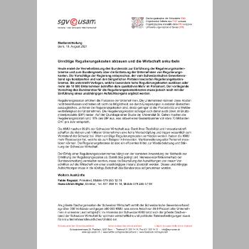 Die KMU machen 99,8% der Schweizer Wirtschaft aus. Dank ihrer Flexibilität und Innovationskraft schaffen die kleinen und mittleren Unternehmen eine hohe Wertschöpfung und tragen wesentlich zum Wohlstand der Schweiz bei. Wenn unnötige Regulierungskosten vermieden werden, haben die KMU mehr Ressourcen frei, welche sie zum Beispiel in Innovation, Markterweiterung oder Personal investieren können. Die Regulierungsbremse ist also ein effizientes Mittel zur Wiederbelebung und Stärkung der Schweizer Wirtschaft.