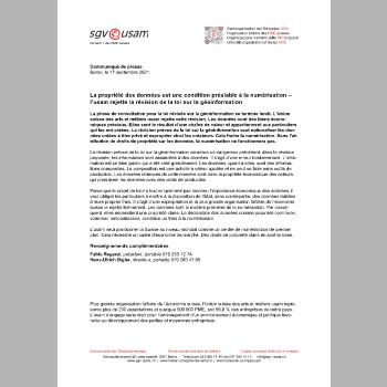 La phase de consultation pour la loi révisée sur la géoinformation se termine lundi. L’Union suisse des arts et métiers usam rejette cette révision. Les données sont des biens économiques précieux. Elles sont le résultat d’une chaîne de valeur et appartiennent aux particuliers qui les ont créées. La révision prévue de la loi sur la géoinformation veut nationaliser les données créées à titre privé et exproprier ainsi les créateurs. Cela freine la numérisation. Sans l’attribution de droits de propriété sur les données, la numérisation ne fonctionnera pas.