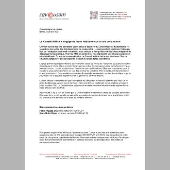 La plus grande organisation faîtière de l’économie suisse se félicite de l’ouverture au public des salles de restaurants. Cette étape permet d’éviter que les pertes économiques subies par la branche n’augmentent encore. L’usam soutient aussi l’ouverture des manifestations. Elles sont importantes pour la société et, plus particulièrement, en vue des prochaines votations. Pour le secteur de l’événementiel et ses fournisseurs, l’augmentation du nombre de spectateurs autorisés représente une étape urgente pour retrouver la sécurité de planification et générer du chiffre d’affaires.